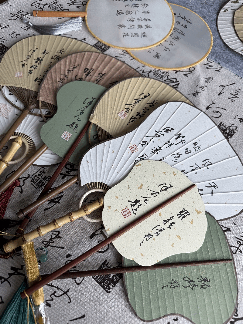 巧思凝结在每一个环节,从挑选扇坯开始,徐步乙便力求丰富多样。男生会收到仿乌木、油竹子等材质的折扇,女生则收到绢布面、宣纸面等团扇,含圆扇、芭蕉扇、蒲扇、长柄腰扇等多种形制与工艺,总计约20种款式。