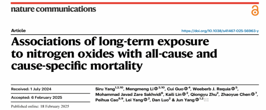 本网讯 2月18日,我校公卫学院杨军教授及合作者在Nature子刊Nature Communications在线发表了氮氧化物疾病谱研究论文Associations of long-term exposure to nitrogen oxides with all-cause and cause-specific mortality。公卫学院硕士研究生杨斯茹与中山大学肿瘤防治中心李萌萌副研究员为该论文共同第一作者,公卫学院杨军教授为论文唯一通讯作者。