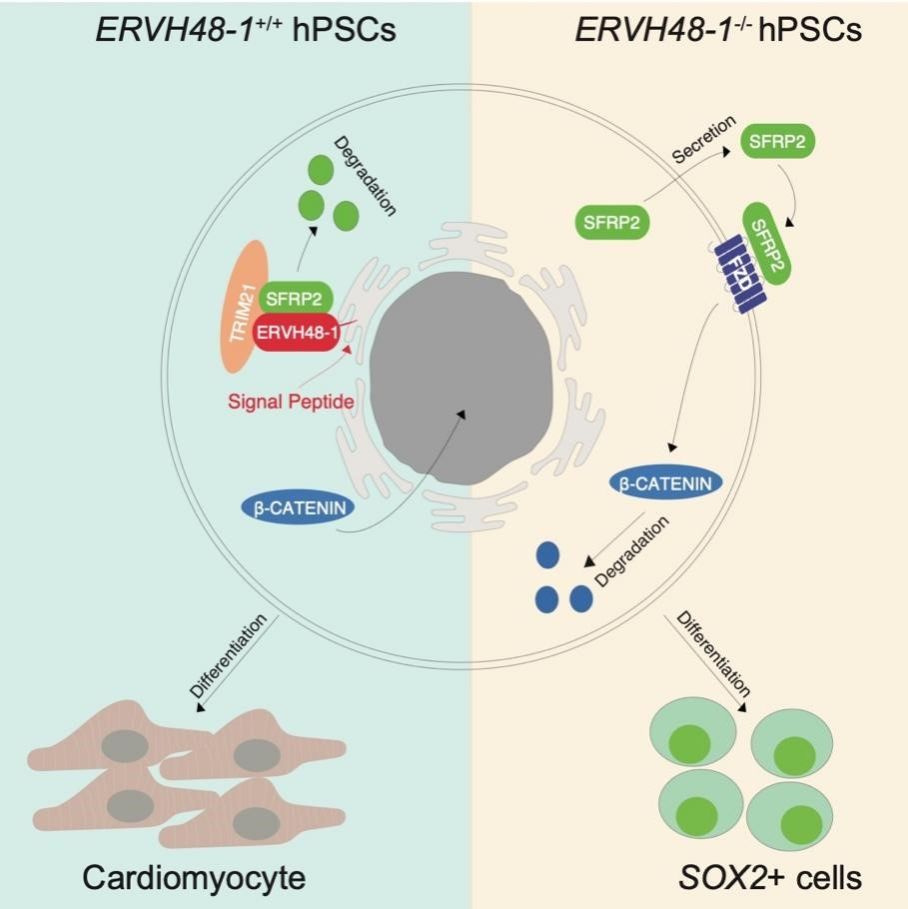 该研究表明,灵长类特有的ERVH48-1(SUPYN/Suppressyn)可编码一种病毒包膜片段,敲除ERVH48-1则会导致中胚层和心肌细胞的分化受损,并将细胞命运引向外胚层样分化路径。从机制上分析,ERVH48-1通过一个功能性N端信号肽定位于亚细胞膜区室,并与WNT拮抗剂SFRP2结合,促进其多聚泛素化和降解,从而限制SFRP2的分泌,阻止其对WNT/β-连环蛋白信号通路的抑制作用。相反,通过敲低SFRP2或表达带有ERVH48-1信号肽的嵌合SFRP2,则可成功恢复心肌细胞的分化。
