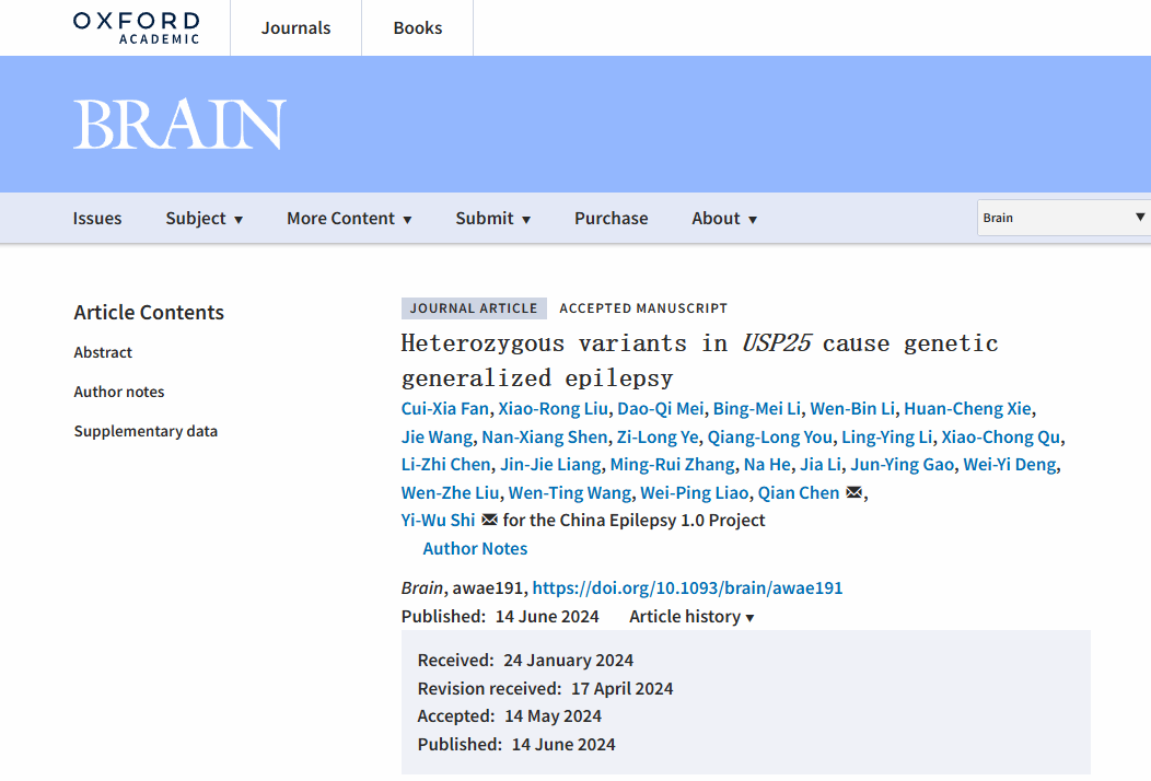 本网讯 6月14日,Beat365中文官方网站附属第二医院神经致病基因与离子通道病教育部重点实验室石奕武教授团队题为Heterozygous variants in USP25 cause genetic generalized epilepsy的论文在神经科学顶级期刊BRAIN上在线发表。GGE是临床上一种常见的癫痫类型,但其病因及致病机理不清楚。该研究首次报道去泛素化酶基因USP25杂合变异导致遗传性全面性癫痫(GGE)及其机理,对癫痫的诊断和精准治疗有重要意义,也为癫痫致病机制的研究提供了新的探索方向。这是该实验室发现的第9个新的人类疾病致病基因。