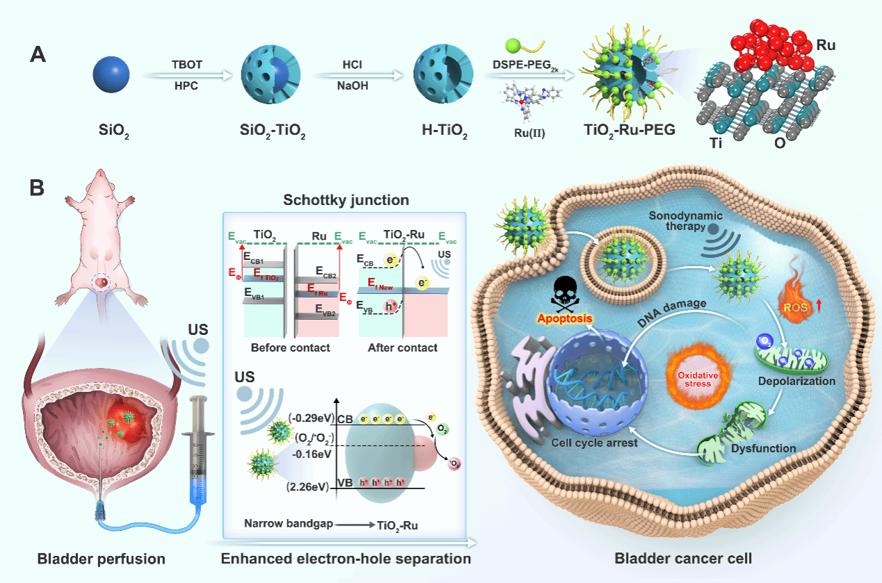 TiO2-Ru-PEG肖特基异质结的合成过程示意图(A)和声动力抗肿瘤机制(B)