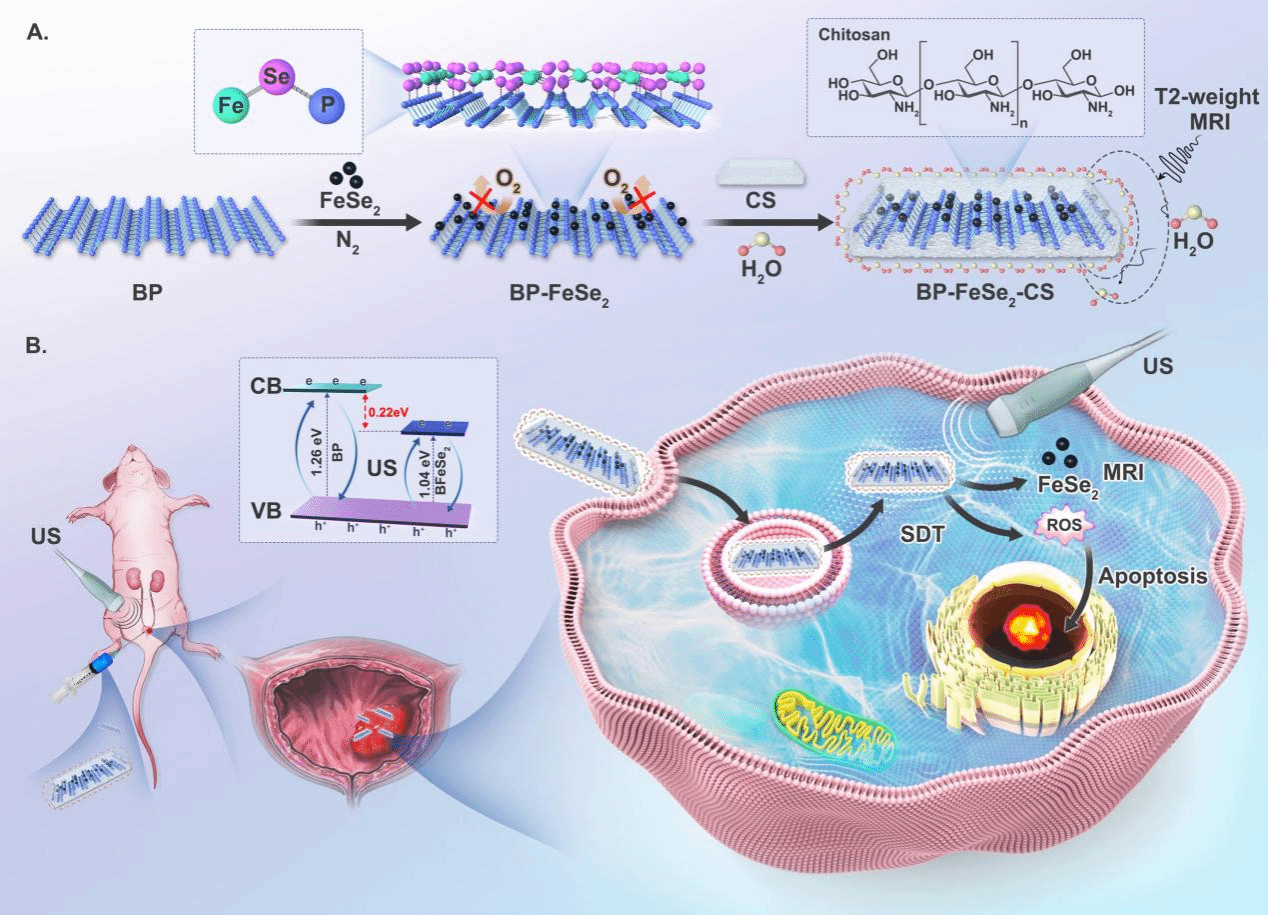 此外,为了提高SDT的抗肿瘤作用和膀胱癌的诊断能力,作者通过P-Se键将FeSe2锚定在黑磷(BP)上,合成了一种基于BP的异质结声敏剂(BFeSe2)。结果表明,BFeSe2在超声(US)照射下,对膀胱癌细胞有明显的细胞毒性。在皮下肿瘤模型和原位肿瘤模型中,BFeSe2对肿瘤生长有明显的抑制效果。此外,BFeSe2还可增强T2加权MR成像,实现对膀胱癌的监测和指导治疗的作用。总的来说,BFeSe2声敏剂结合MRI进行精确治疗,在膀胱癌的治疗中具有较强的临床应用潜力。该研究以Ferrous selenide stabilized black phosphorus heterojunction sonosensitizer for MR imaging-guided sonodynamic therapy of bladder cancer为题发表在医学一区期刊Biomaterials Research(DOI: 10.34133/bmr.001)上。我校硕士研究生吴思丞为第一作者,南山学者刘宏星研究员为最后通讯作者。