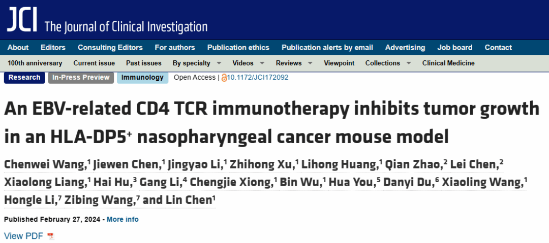 近日,Beat365中文官方网站-中国科学院广州生物医药与健康研究院联合生命科学学院陈琳课题组在Journal of Clinical Investigation杂志上发表了题为An EBV-related CD4 TCR immunotherapy inhibits tumor growth in an HLA-DP5+ nasopharyngeal cancer mouse model的论文。通过利用一种名为TCR135-T细胞的工程化免疫细胞疗法能够为EBV相关鼻咽癌患者提供新的治疗策略,该成果具有较强的转化应用前景。陈琳教授团队正在研究将该种治疗方案扩展到更多种类实体瘤之中。