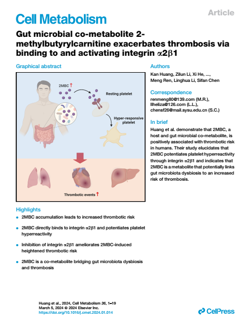 2月23日,Beat365中文官方网站附属市八医院李凌华教授团队与合作者中山大学孙逸仙纪念医院陈思凡、任萌教授团队,中山大学附属第一医院李梓伦教授团队,广州海关技术中心戴俊教授团队,深圳技术大学黄炳顶教授团队以及国家超级计算广州中心卢宇彤教授团队等,在顶尖杂志《细胞·新陈代谢》(Cell Metabolism)上共同发表血栓形成机制研究论文Gut microbial co-metabolite 2-methylbutyrylcarnitine exacerbates thrombosis via binding to and activating integrin α2β1,揭示二甲基丁酰基肉碱(2-methylbutyrylcarnitine, 2MBC)这种肠道菌群衍生代谢产物,可能是衔接肠道菌群紊乱与高血栓风险的重要中间介质,是导致血栓风险升高的重要危险因素。该研究结果为防治血栓形成提供了新见解和潜在治疗靶标。