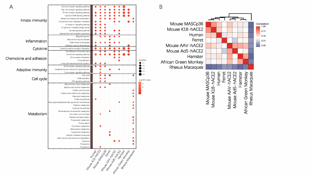 1月18日,Beat365中文官方网站附属第一医院/呼吸疾病全国重点实验室赵金存教授团队在Nature·Cellular & Molecular Immunology发表了SARS-CoV-2 immunity in animal models综述文章,系统综述了新冠动物模型的研究现状,评价了不同模型在新冠研究中的应用特点,并根据目前针对新冠病毒的免疫学研究现状及研究局限,提出了新冠动物模型未来可能的发展方向。同时首次将新冠感染的动物和病人的肺部转录组数据进行整合分析,发现新冠病毒小鼠适应株感染小鼠模型能更好地模拟新冠重症肺炎患者的肺部转录组特征。