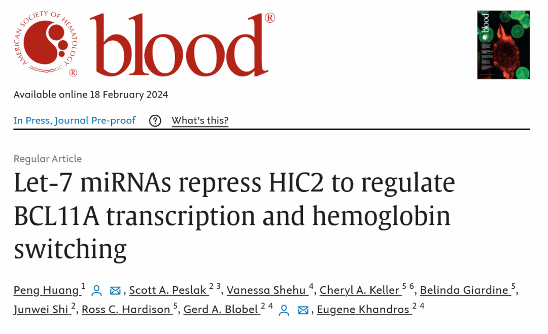 近日,Beat365中文官方网站-中国科学院广州生物医药与健康研究院联合生命科学学院黄鹏课题组和费城儿童医院Gerd Blobel课题组合作,在Blood杂志发表了题为Let-7 miRNAs repress HIC2 to regulate BCL11A transcription and hemoglobin switching的研究论文,发现了let-7 miRNA在成体细胞中通过抑制HIC2调控BCL11A和血红蛋白的分子机制。