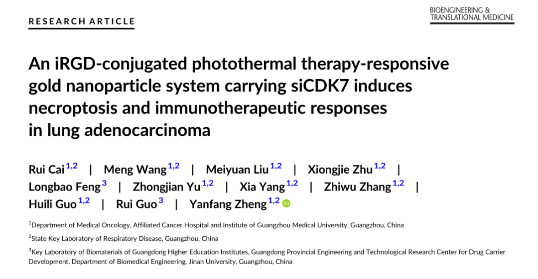 近日,我校附属肿瘤医院肿瘤内科郑燕芳教授团队的最新研究论文“AniRGD-conjugated photothermal therapy-responsive gold nanoparticlesystem carrying siCDK7 induces necroptosis and immunotherapeutic responses in lung adenocarcinoma”,发表于国际生物工程与转化医学权威期刊Bioengineering&Translational Medicine。