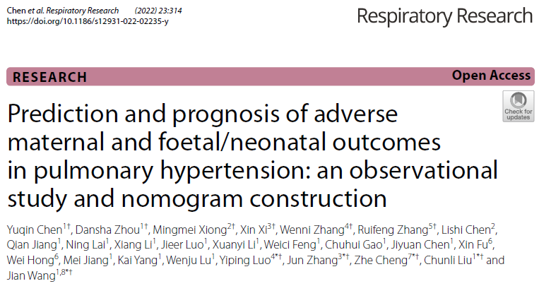 近日,我校国家呼吸医学中心、附属第一医院、广州呼吸健康研究院王健教授团队组织了一项全国多中心临床研究,收集肺动脉高压妊娠患者的临床信息并进行随访,建立预测孕妇及胎儿新生儿发生临床不良事件及长期生存的预测模型,为辅助临床决策和产前咨询提供科学的工具。相关论文“Prediction and prognosis of adverse maternal and foetalneonatal outcomes in pulmonary hypertension an observational study and nomogram construction” 于近日在线发表于Respiratory Research。