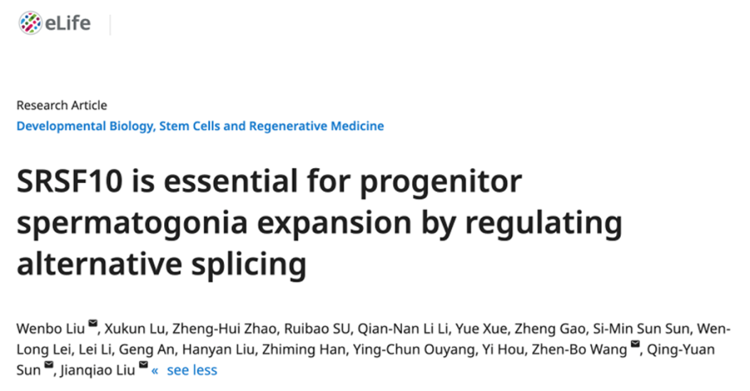近日,我校附属第三医院刘见桥教授和刘文博副研究员团队、广东省第二人民医院孙青原教授团队和中国科学院动物研究所王震波研究员团队合作在eLife发表了题为“SRSF10 is essential for progenitor spermatogonia expansion by regulating alternative splicing ”的研究论文,揭示了剪接因子SRSF10在维持精原祖细胞(progenitor spermatogonia)增殖以及存活过程中发挥的重要功能和作用机制。