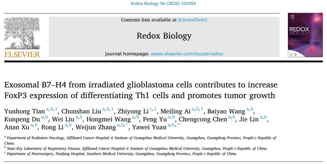 近日,我校附属肿瘤医院放疗科袁亚维教授团队的最新研究论文“ExosomalB7-H4 from irradiated glioblastoma cells contributes to increaseFoxP3 expression of differentiating Th1 cells and promotes tumorgrowth”,发表于国际生物医学领域Top期刊Redox Biology。