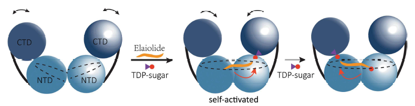 研究发现ElaGT在底物诱导下可以形成一种具有连续通道的二聚体,该通道长度可允许一个Ela分子在通道内穿梭。该二聚体的组装方式与激活子依赖型糖基转移酶中酶和配体的作用模式类似,其二聚界面可以间接调控糖基结合位点。该酶可能采用的是一种自激活二聚化模式识别并催化糖基转移,而该界面可能是潜在的酶活以及底物特异性的调控位点。该研究为合成具有更好抗菌活性的新颖类似物提供新思路。