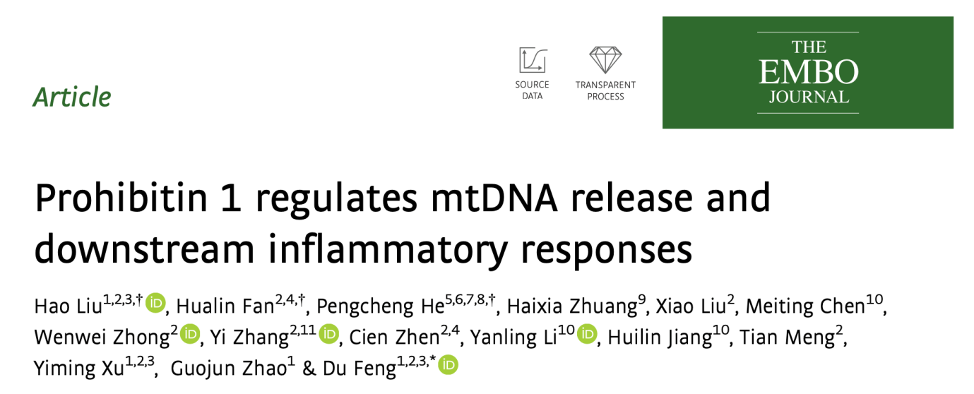 近日,我校基础医学院冯杜教授团队发现线粒体内膜蛋白Prohibitin1(PHB1)下调后,促进SPG7相关的线粒体通透性转换孔(mitochondrial permeability transition pore,mPTP)开放,进而导致线粒体DNA释放。释放至细胞质中的线粒体DNA进一步激活炎症小体以及cGAS-STING通路,介导炎症进展。相关研究“Prohibitin 1 regulates mtDNA release and downstream inflammatory responses”以论著形式发表于国际知名期刊《The EMBO Journal》。本文的发现为线粒体DNA的释放机制,提供了重要补充,有望为多种炎症相关疾病的治疗提供坚实理论基础。