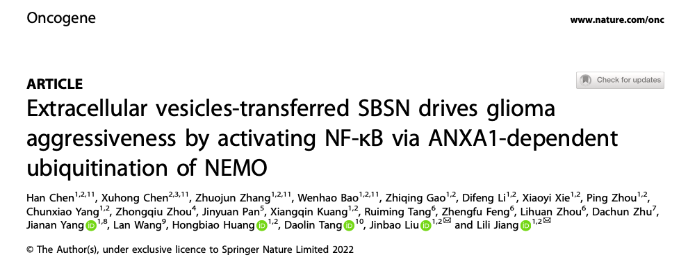 近日,我校基础医学院广东省蛋白质修饰与降解重点实验室刘金保、蒋丽丽教授团队研究揭示了细胞外囊泡(Extracellular vesicles,EVs)介导的癌蛋白SBSN细胞间转运激活NF-B信号通路促进胶质瘤侵袭的重要机制。相关研究“Extracellular vesicles-transferred SBSN drives glioma aggressiveness by activating NF-B via ANXA1-dependent ubiquitination of NEMO”发表在期刊《Oncogene》。该研究结果证实EVs携带并转运SBSN蛋白在胶质瘤细胞间实现信号和功能传递,同时对胶质瘤NF-B通路调控关键蛋白的多泛素化修饰过程提供了新的理论支持。