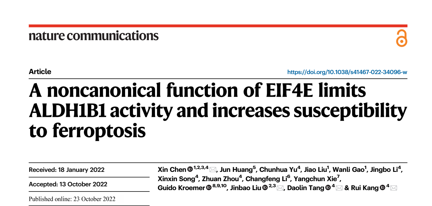 近日,我校基础医学院陈鑫副研究员及刘金保教授团队发现真核起始因子4E (EIF4E)通过非翻译功能促进铁死亡。EIF4E可以与醛脱氢酶1家族成员B1(ALDH1B1)结合从而限制ALDH1B1介导的4HNE清除。作者发现4HNE不仅是脂质过氧化的产物,也可以通过促进脂质过氧化引起铁死亡。相关研究“A noncanonical function of EIF4E limits ALDH1B1 activity and increases susceptibility to ferroptosis”以论著形式发表于国际知名期刊《Nature Communications》。本文发现可能为理解铁死亡的效应机制提供一个新的代谢理论基础。