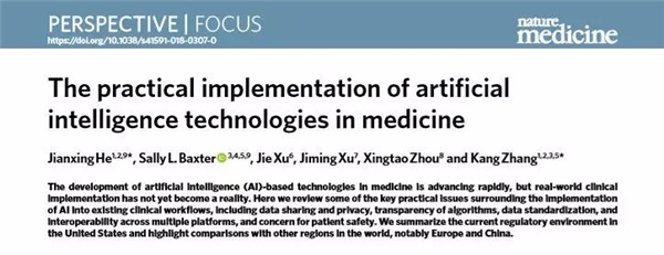 广医在线讯 2019年伊始,刚获得国家科技进步奖二等奖、我校附属第一医院的何建行教授与该院特聘教授、加州大学圣地亚哥分校(UCSD)人类基因组医学研究所所长张康教授,在最新一期的Nature Medicine上发表了一篇深度综述,梳理和预测了AI技术在医疗健康领域的实施现状与未来发展。