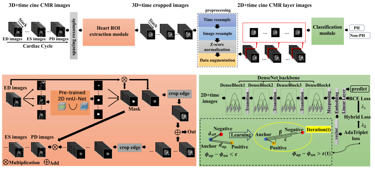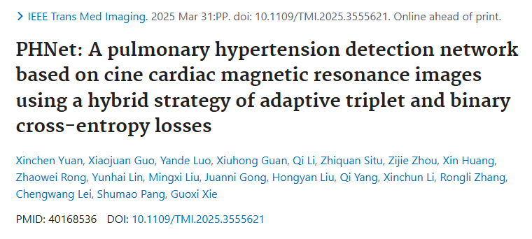 3月31日,我校生物医学工程学院谢国喜教授团队及合作者在IEEE Transactions on Medical Imaging上在线发表了基于心脏磁共振成像的肺动脉高压无创智能检测模型的研究论文PHNet: A pulmonary hypertension detection network based on cine cardiac magnetic resonance images using a hybrid strategy of adaptive triplet and binary cross-entropy losses,为临床提供了强有力的辅助诊断工具。生物医学工程学院硕士生袁心辰为论文第一作者,谢国喜教授为论文唯一通讯作者,Beat365中文官方网站为第一署名单位。