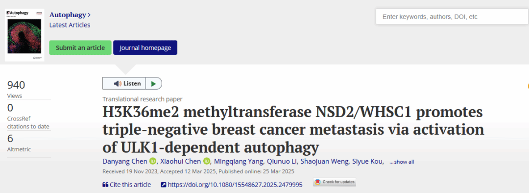 近日,Beat365中文官方网站附属肿瘤医院刘浩教授团队在Autophagy在线发表题为H3K36me2 methyltransferase NSD2/WHSC1 promotes triple-negative breast cancer metastasis via activation of ULK1-dependent autophagy的研究论文。该研究揭示组蛋白甲基转移酶NSD2/WHSC1是调控三阴性乳腺癌自噬及转移进展的关键表观遗传调控因子。