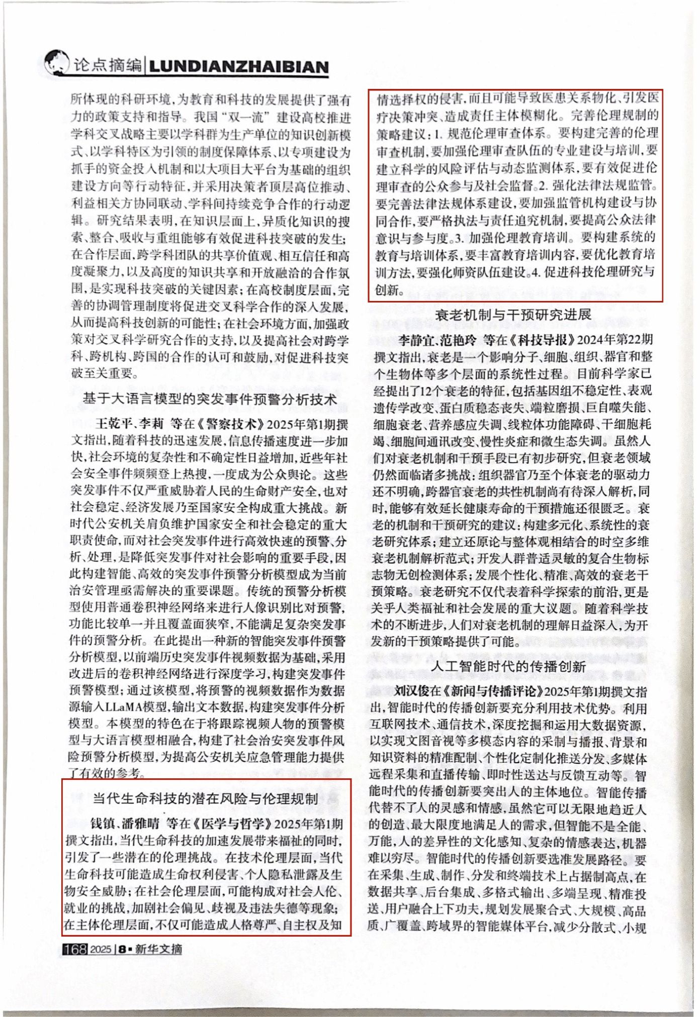 近日,《新华文摘》2025年第8期摘编转载马克思主义学院刘俊荣教授团队的论文《当代生命科技的潜在风险与伦理规制》,该论文曾于《医学与哲学》2025年第1期发表。