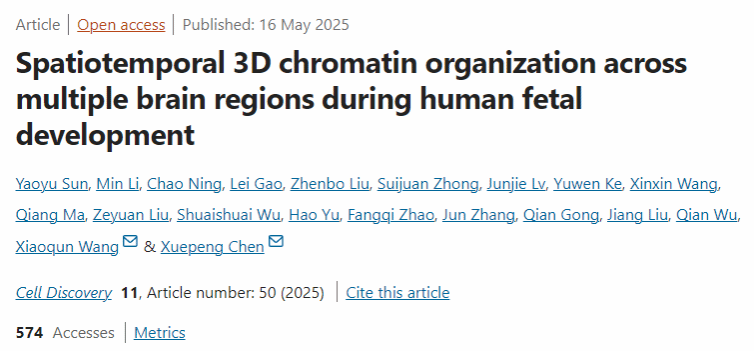 近日,广医-广州生物院联合生科院特聘教授陈雪鹏研究员与北京师范大学王晓群教授、中国科学院生物物理研究所刘江研究员合作,绘制了人妊娠发育中期的胚胎多脑区高分辨率染色质三维构象图谱,发现了脑区特异性染色质高级结构参与调节脑区发育,为理解不同脑区胚胎期发育的分子调控机制提供了新知识。5月16日,团队在《Cell Discovery》上发表研究成果《Spatiotemporal 3D chromatin organization across multiple brain regions during human fetal development》。