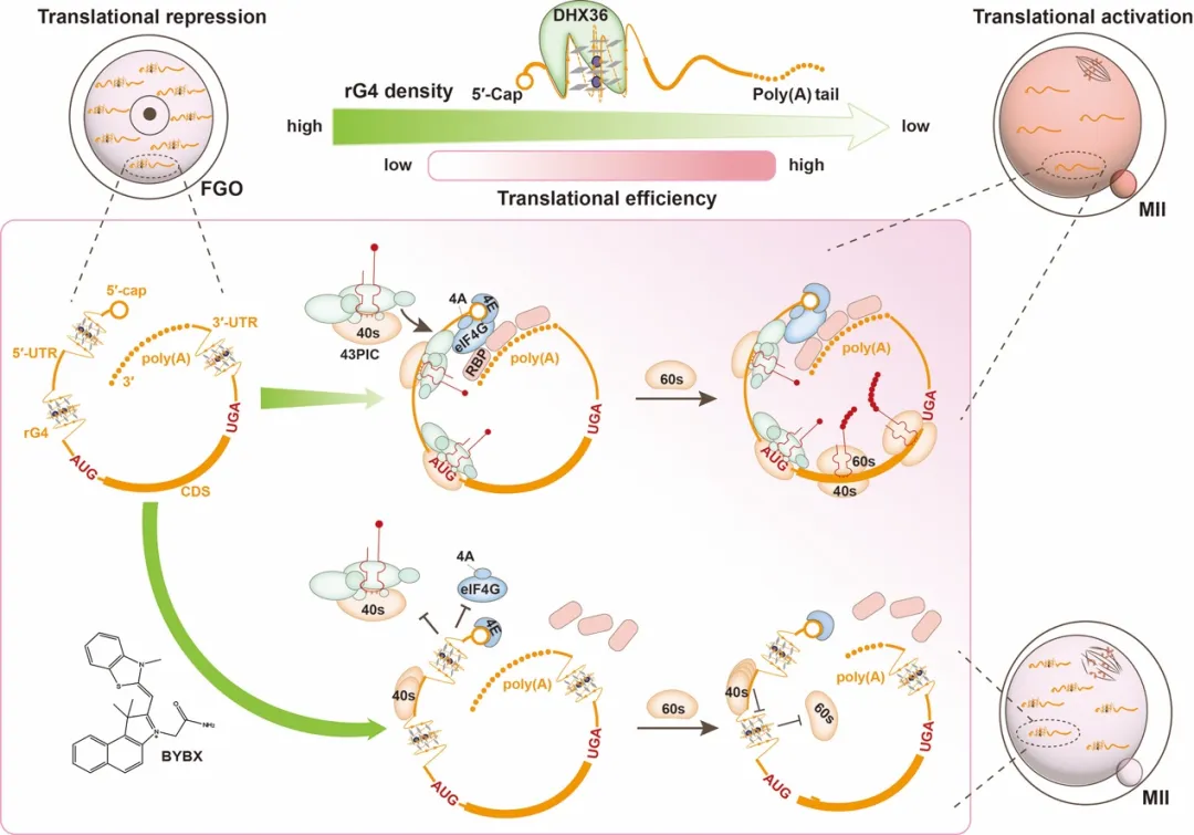 团队发现经BYBX处理后RNA G4s的积累削弱了大量 RBPs 与 mRNA 的结合,尤其是与翻译起始相关的RBPs。结合超灵敏翻译组测序技术(Ribo-lite) 进一步证实,UTR区域的RNA G4在减数分裂过程中的去折叠失败,将抑制转录本的整体翻译效率。这种由RNA G4累积导致的翻译水平低和发育缺陷在解旋酶DHX36的作用下能够发生部分逆转,表明RNA G4在调控卵母细胞翻译激活过程中的重要性。