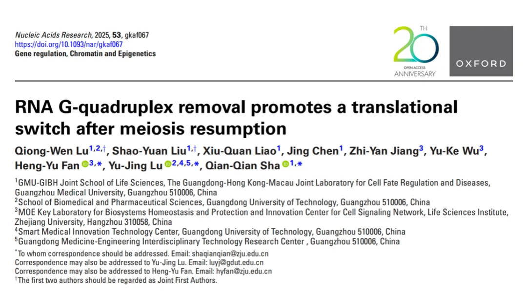 近日,广医-广州生物院联合生科院沙倩倩团队在Nucleic Acids Research(《核酸研究》)上发表题为RNA G-quadruplex removal promotes a translational switch after meiosis resumption的文章。该研究针对卵母细胞样本量少的特点,开发了低输入、高灵敏度的G4-LACE-seq技术,成功在小鼠卵母细胞中绘制了全转录组RNA G4s的动态分布图谱。研究发现,RNA G4在卵母细胞的母源转录本中广泛分布,尤其在非翻译区(UTR)富集,并且在减数分裂恢复后会发生全转录组范围的去折叠。由于RNA和DNA 去折叠通常由相同的酶调控,因此传统基因敲除策略会同步影响卵母细胞中RNA G4与DNA G4稳定性,团队使用合作者开发的RNA G4小分子配体BYBX能够特异性稳定卵母细胞中的RNA G4,并发现RNA G4稳定会破坏纺锤体组装和减数分裂细胞周期进程,证实了G4在RNA转录后调控的重要作用。