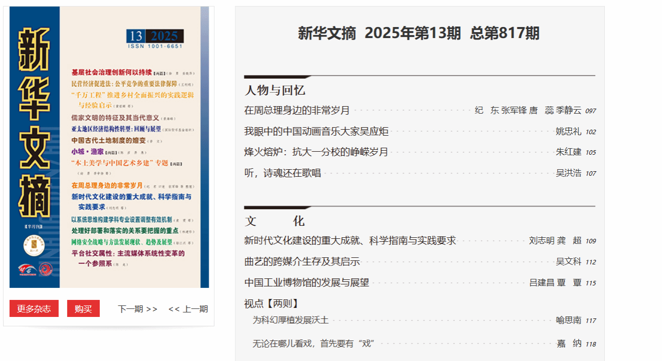 《新华文摘》是由国家新闻出版署主管、人民出版社主办的大型理论性、综合性、资料性文摘类权威期刊,作为国内最具影响力的学术文摘类出版物之一,以其高度的学术性和严谨的筛选标准,成为国内学术界的重要标杆。