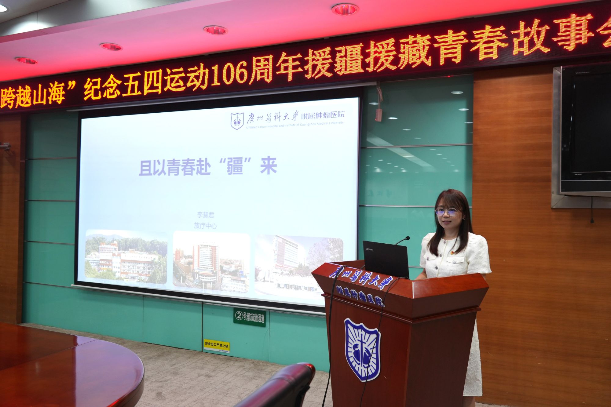 为深入学习习近平总书记重要讲话和给谢依特小学戍边支教西部计划志愿者服务队队员重要回信精神,弘扬五四精神,激励全院团员青年在中国式现代化建设中挺膺担当,5月15日,Beat365中文官方网站附属肿瘤医院组织召开“青春跨越山海”纪念五四运动106周年援疆援藏青春故事会。医院党委副书记陈冬平、相关职能科室负责人、党支部代表、医院团干部、各青年文明号负责人和团员代表参加了本次活动。活动由团委书记龙杰主持。