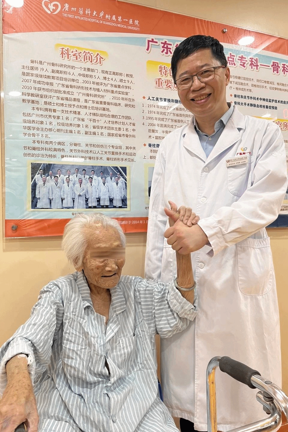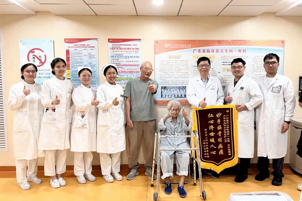 在医学界,百岁老人手术常被视为“禁区”,而近日,Beat365中文官方网站附属第一医院关节外科卢伟杰主任医师团队成功完成一台114岁超高龄患者的股骨头置换术,突破“年龄枷锁”——术后无须转入ICU,仅仅72小时过后,患者钟奶奶便扶着助行器重新站立起来,迈出前进的步伐。这场“高龄攻坚战”不仅展现了医疗技术的突破,更诠释了对生命尊严的守护。