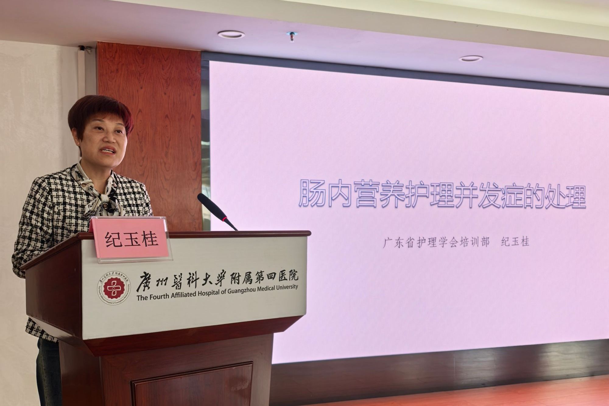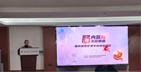 针对医院在肠内营养工作中存在的困惑,纪玉桂主任以《肠内营养护理并发症的处理》为题作专题报告。她以肠内营养护理并发症处理为切入点,系统阐释了肠内营养示范病房的建设路径,并结合临床实际,详细讲解了营养筛查与评定、营养通路建立与维护、营养液输注规范等核心内容。授课内容既有政策高度,又有实践深度,为与会人员提供了宝贵的理论指导与实践启示。